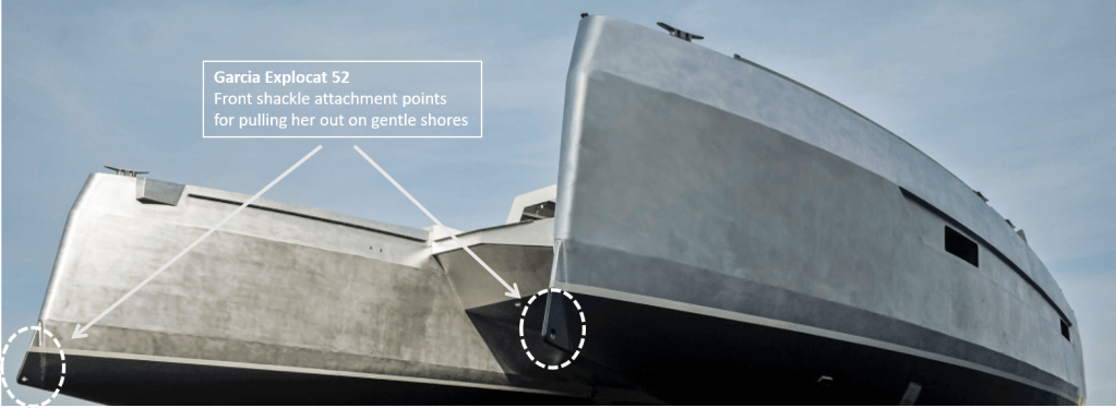 - Hauling out: the consensus is that facilities to haul-out an 20t catamaran with an 8m+ beam are quite scarce in high latitudes. On another hand, it’s easier for a cat to beach over a tidal swing, as these increase with latitude. The Garcia Explocat 52 has a smart hull design feature, allowing to attach two shackles and tractor her out of the water on any rolling logs, provided it is a gentle slope shore.