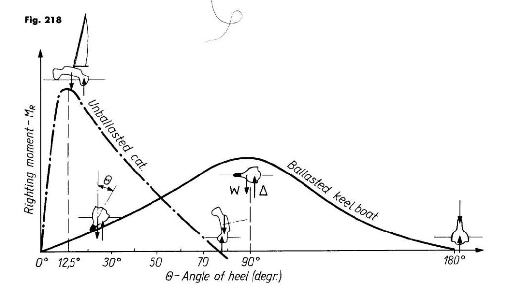 | Safety | In the most extreme situations, it all comes to “stability curve” and “righting moment”, although that won’t be the most attractive feature one looks at when considering a new boat. From this standpoint, obviously monohull have the advantage there. But in these extreme situations, any small boat design and their crew is at risk. Capsizing a monohull is likely to bring her down, while catamarans are supposes to have a natural buoyancy for them to float while capsized. | While it is a fact that catamaran are as stable standing upward as they are while capsized, advanced and more reliable forecasts should and in fact do limit there occurrences. But there is a cruiser forum titled “How many cats have flipped ?“, and the funnier post is “once per involved catamaran“. Another safety point to consider, in fact a way more common one, is crew safety on regular or heavy condition boat handling. While not precisely as “stable” as usually advertised, moving around a catamaran is considered to be safer than on the deck of a 20° heeled monohull. |