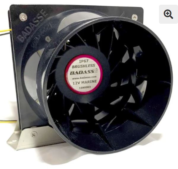 Badasse’ Brushless Model 4 Marine Fan: 190CFM, IP67 Waterproof? 2.5 Amps 8-16v. claims 40% less current than brushed equivalents.