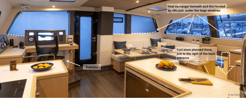 We read about this Arctic expedition sailor, who planned for his next boat to run heated tubes under his living area windows to prevent condensation, but given our layout, we don’t think it’s realistic with heated tubes. Following-up on the same line of thoughts, maybe a heat-exchanger coupled with thin slits just beneath them could deal with the living-area very large windows issue.