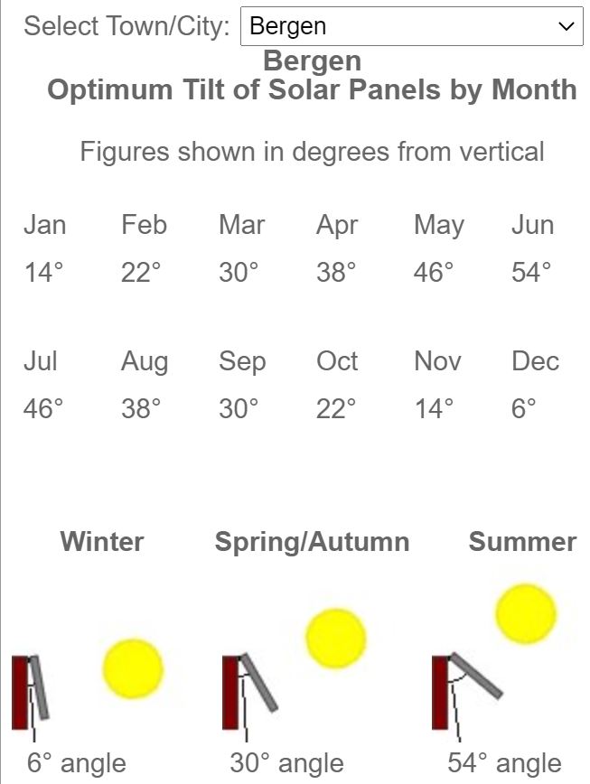 For instance, if the sun angle is 30° out of the perpendicular (Bergen in March), the output will be 1-87% = 13% of maximum.