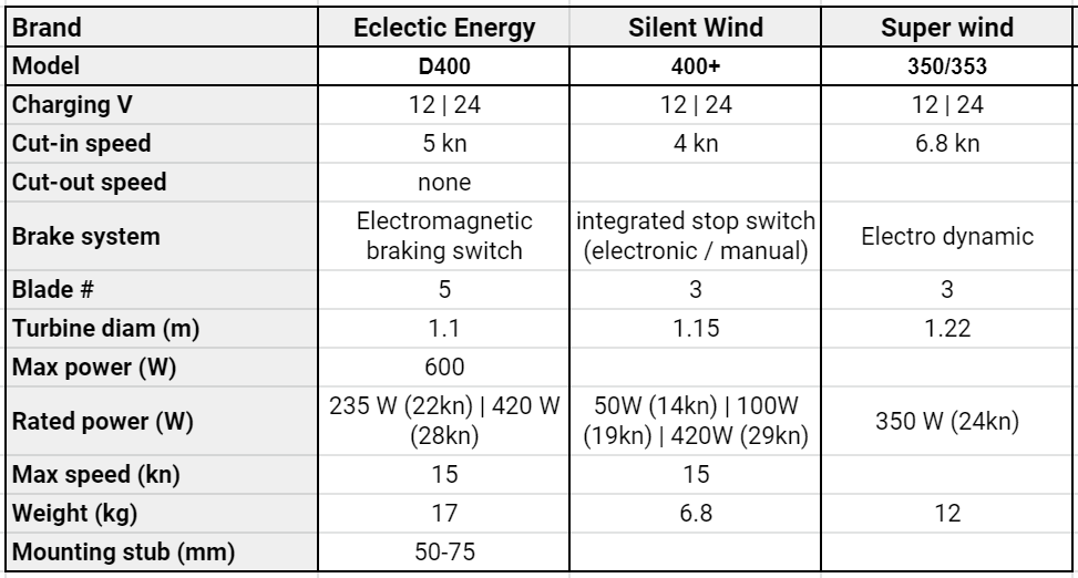 Wind generators were a must-have a decade ago for long range boats, especially the ones sailing in high latitude areas. Many would complain of the noise or vibrations, but most would agree that night and day production made it a useful complement to solar and hydro generation. We’ve had a d400 for over 10 years, and it did induce some significant nuisance after it was damaged by a hasty reefing. Since its replacement, we can’t complain about any noise or vibration. The use case for a wind turbine would be “extended off-the-grid mooring (or anchorage of course) in windy and mainly overcast location”, and we’ll run it in our energy model.