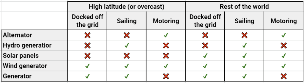 The goal of the energy production systems installed on board is to cover the large array of situations a long range boat will encounter. While solar panels are now the way to go in most places, their output in high latitude will be too low to cover the boat’s needs. And along with the redundancy principle, at any given time, we want two relevant energy production systems available.