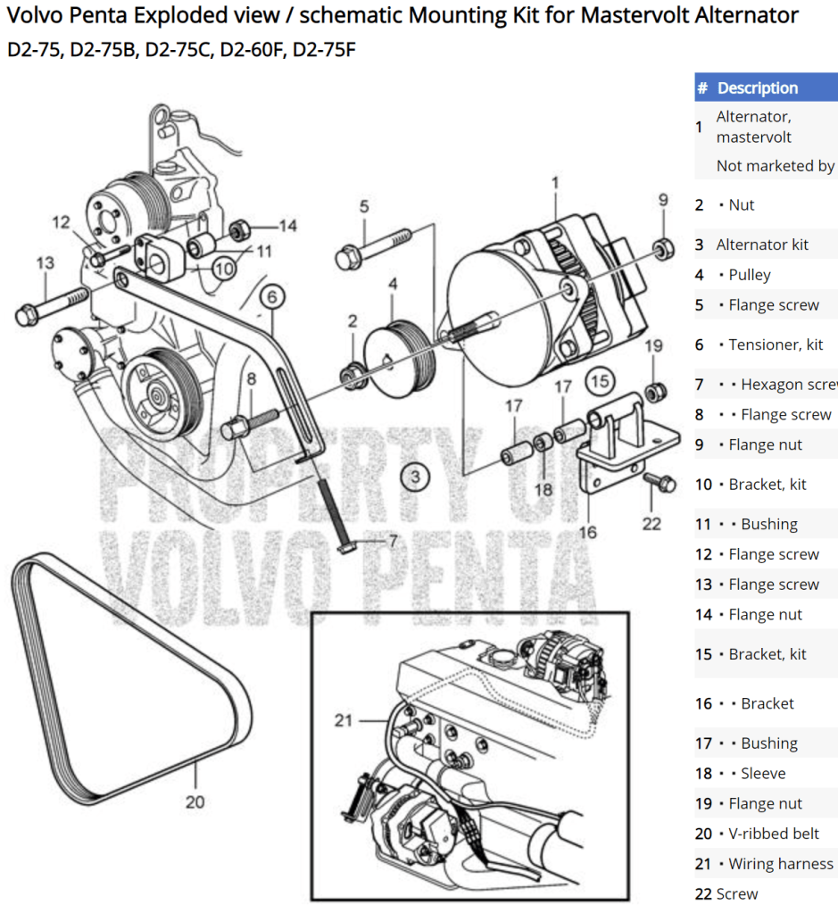 But we did find a kit allowing for the installation of a Mastervolt alternator in Volvo’s part store, as shown here: optimized to deliver continuous high power output in storage applications, suitable for all battery types, including Lithium Ion, high charge current at idle RPM.