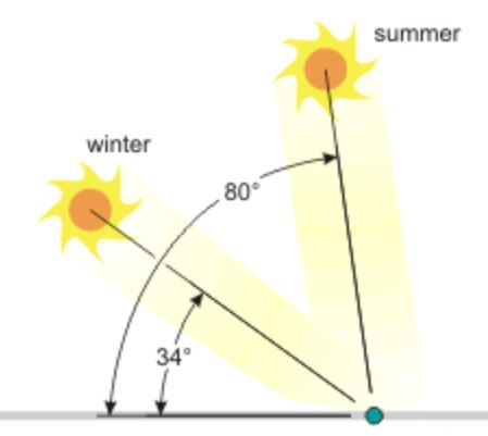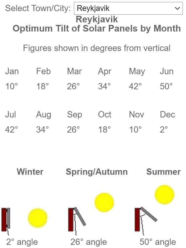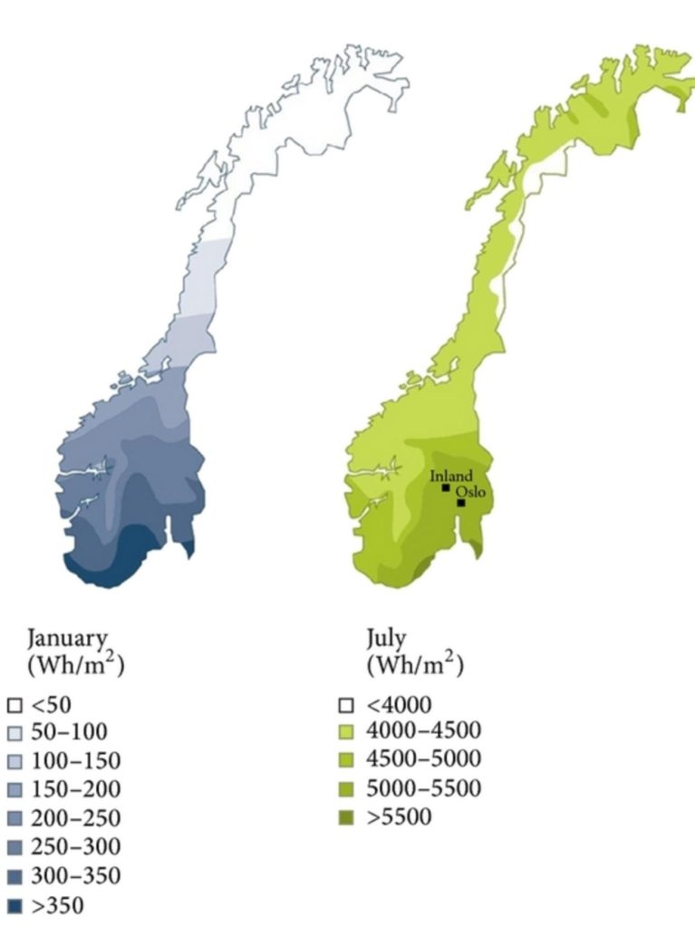 As an example, we can see here how Norway gets 10x more W/m2 in July, compared with January. Nominal solar output (Wh) will be reduced depending on the solar angle (A), and the loss (L) can be calculated with the formula: