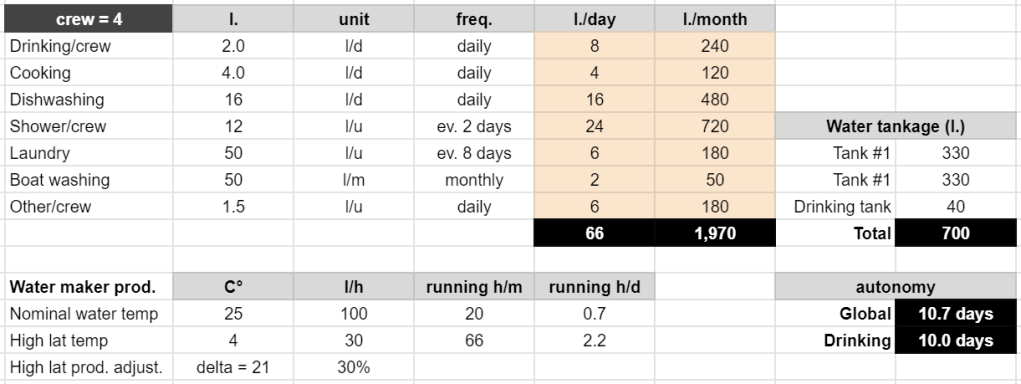 Standard tankage is 2×500 l, but there is the possibility to add 2×250 l, either for fuel or for grey water. In the short term, aiming for Northern latitude where fuel autonomie is key, we would opt for additional fuel tanks, ready to reverse this in a few years.